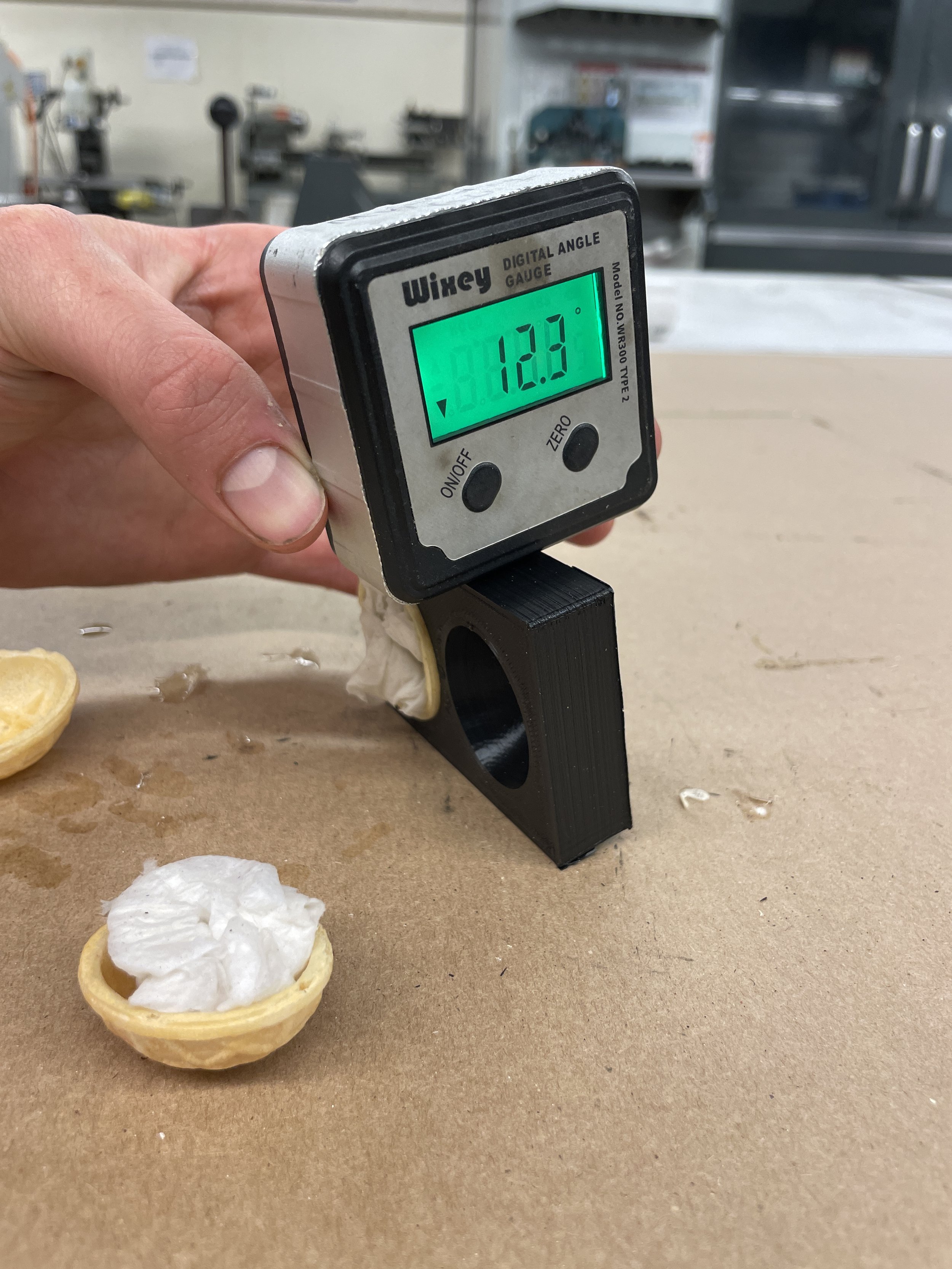 Testing the angle shells fall out of wheel with 3D printed jig and digital protractor