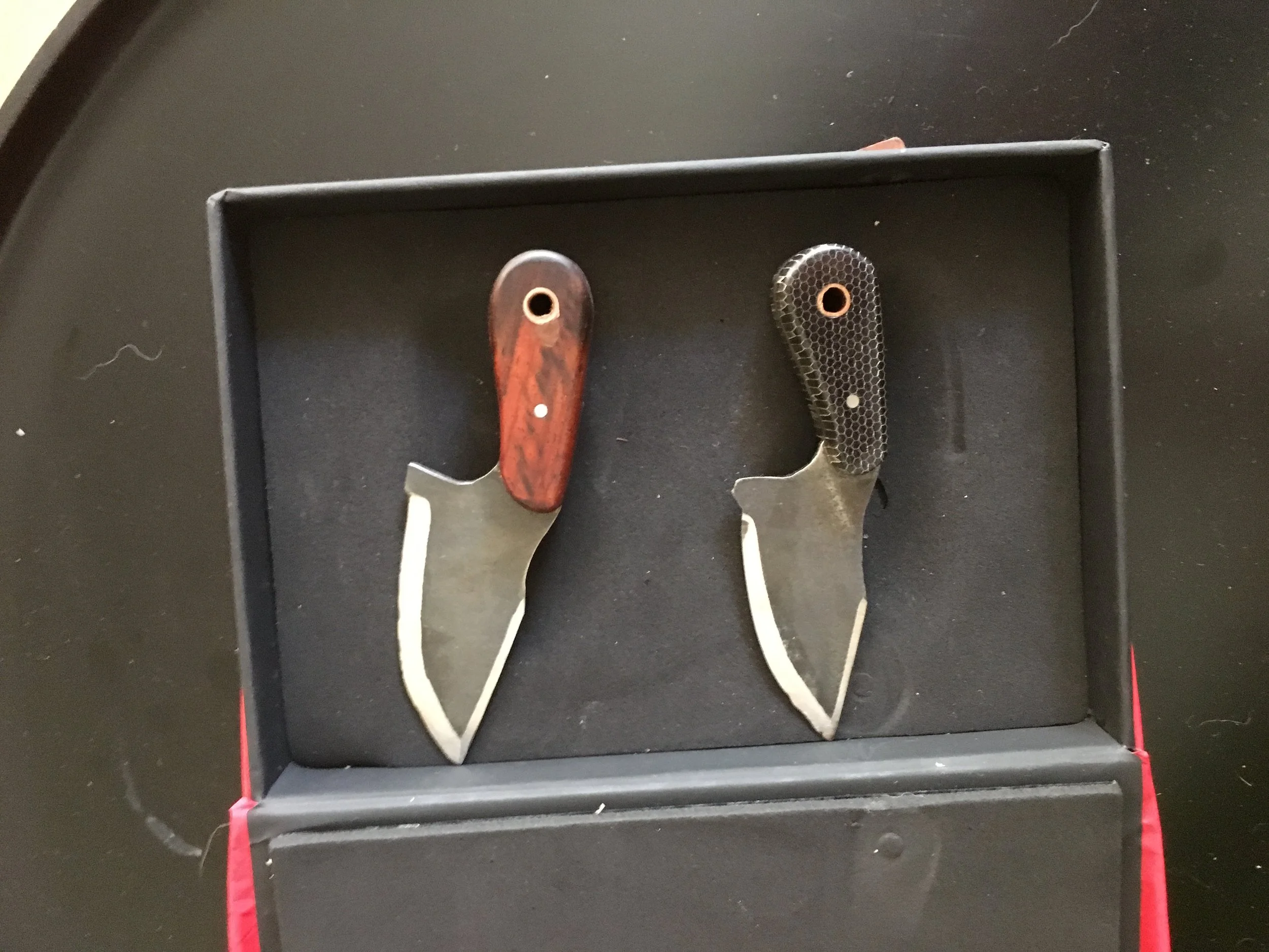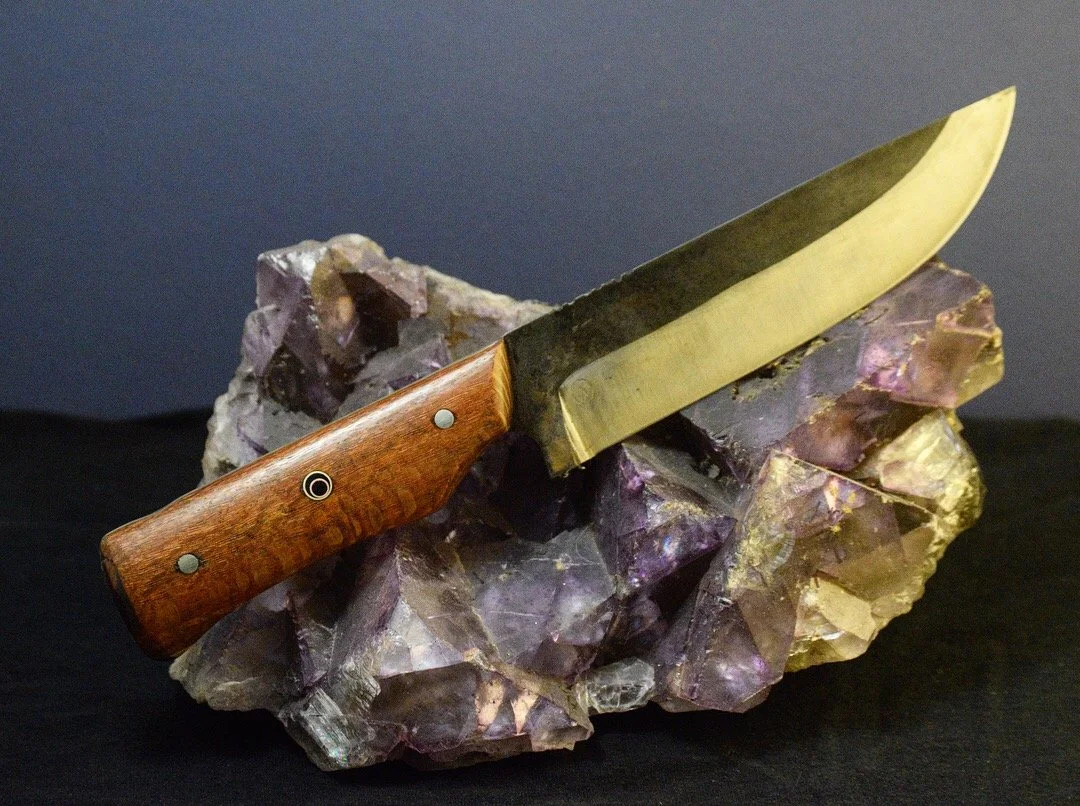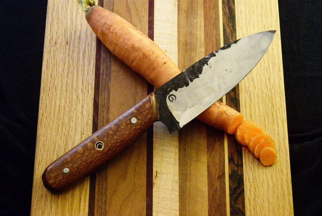 Process: Each knife starts with a sketch, which used to litter the margins of my homework. A chosen design is traced to bar steel, ground to shape, sharpened, tempered, heat treated, and a wood handle is shaped . I love all the little rabbit holes like learning to make my own mosaic pins or etch my logo into the blade.
